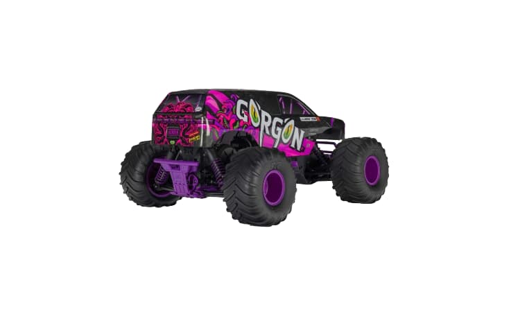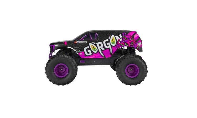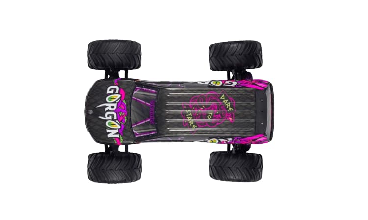 • El GORGON no necesita opciones adicionales para convertirte en el centro de atención desde el primer momento. Nada más sacarlo de la caja, su impactante y original apariencia atrae a multitudes. La carrocería ahora está disponible en más opciones de colores brillantes que nunca, con llantas, muelles de amortiguación, bandeja de batería, placas protectoras y parachoques delantero y trasero a juego que resisten los impactos y protegen esos gráficos dinámicos.