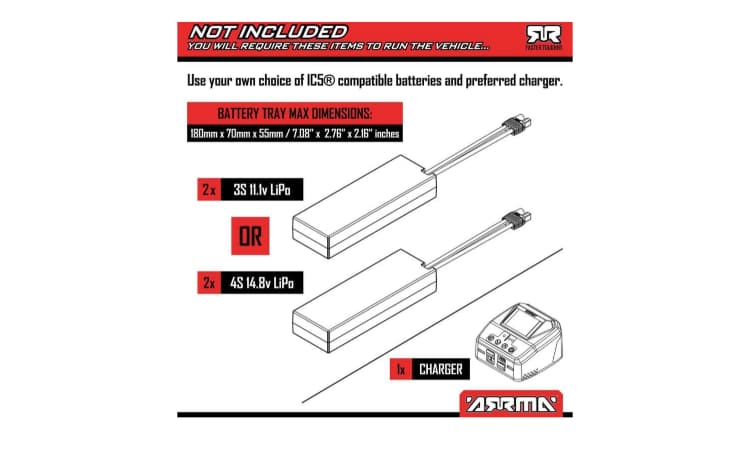 • Recién salido de la caja, este coche RC de producción listo para usar viene equipado con todo lo necesario para dominar el asfalto, dejar en ridículo a los superdeportivos y dejar huellas de neumáticos en tu memoria. Simplemente instala la batería LiPo rígida 6S u 8S que prefieras y añade un cargador, y tendrás las llaves del RC de producción más rápido jamás construido. Ahora estás listo para liberar el máximo potencial de velocidad de ARRMA.