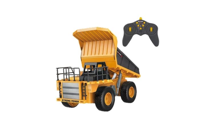- 9 canales con movimientos variados controlados desde la emisora: conducción en cualquier dirección, sube y baja la caja para soltar escombros o tierra como un camión real, función de volcado con apretar un simple botón, o rotación del camión en 360º.