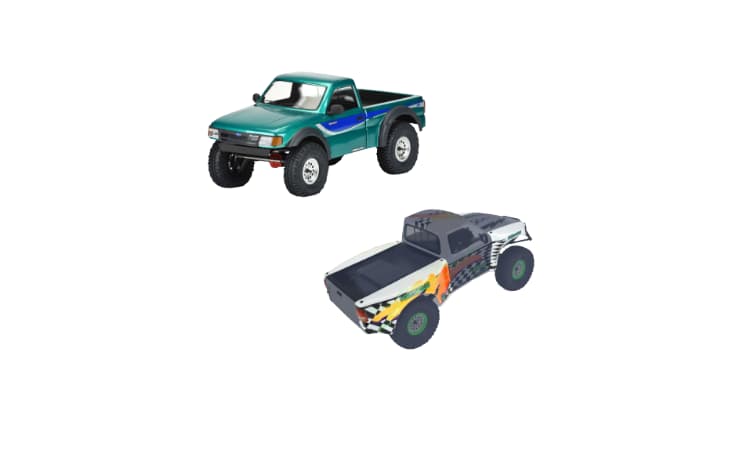 - La carrocería incluye una pieza moldeada de plástico negro y cubos de luces con lentes transparentes para los faros delanteros y luces LED de 5 mm (PRO631700) e intermitentes LED de 3 mm (por separado). Incluye retrovisores laterales y tiradores de las puertas de plástico moldeado, réplicas a escala real de las piezas de la Ford® Ranger de 1993. La cabina y la cama tienen piezas separadas para un mayor realismo a escala real y están fabricadas en policarbonato cristalino, que se pueden pintar con el color de fábrica de la Ranger o del color que prefiera.