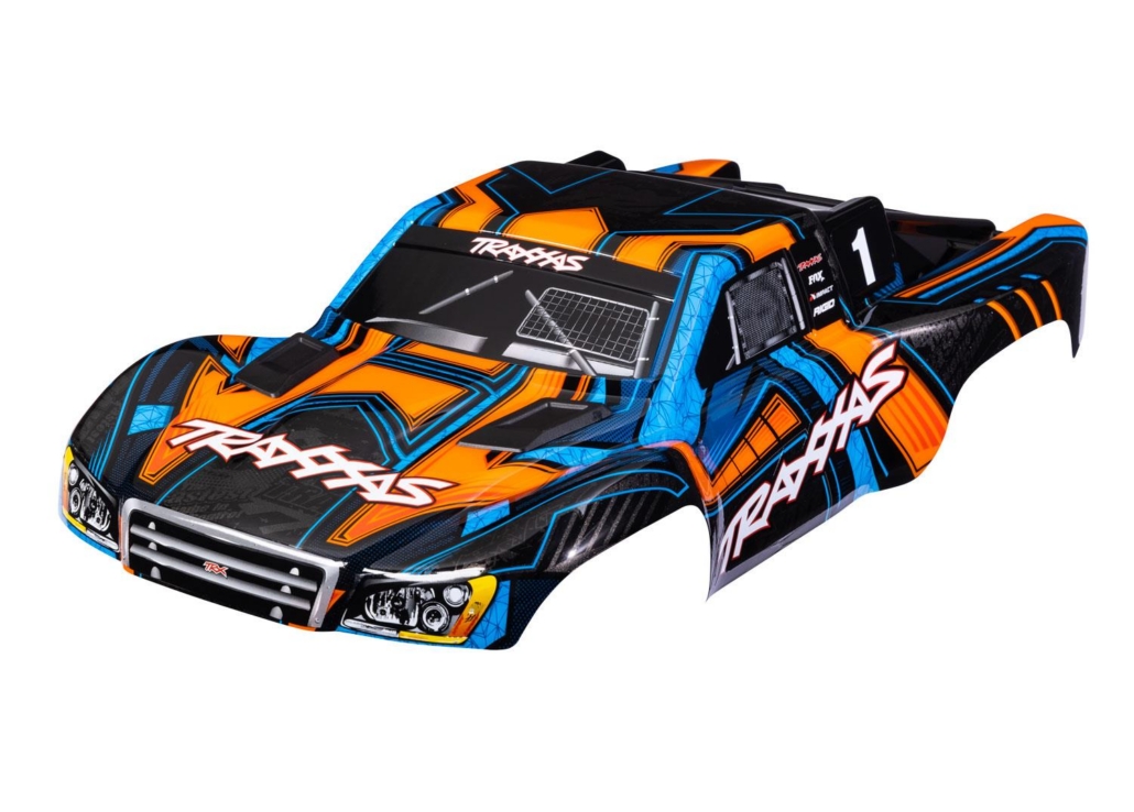 Carrocería, Slash 4X4 (también compatible con Slash VXL y Slash 2WD), naranja y azul (pintada, calcomanías aplicadas) (ensamblada con pestillos delanteros y traseros para montaje sin clips)