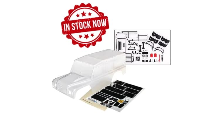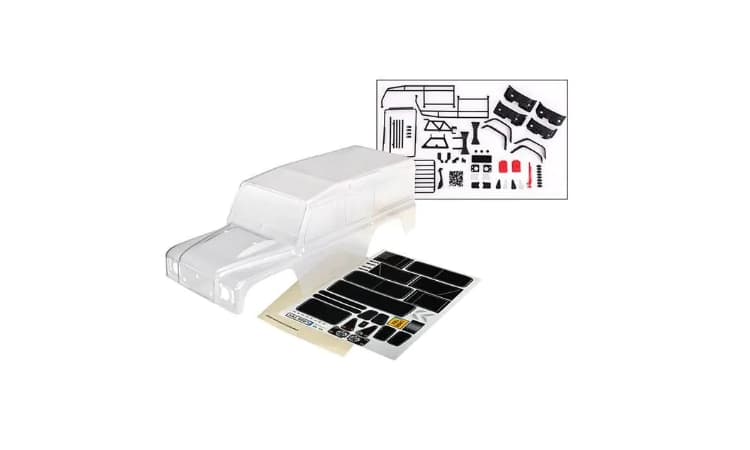 - La carrocería transparente TRX-4 Land Rover Defender viene completamente recortada y lista para pintar, con lámina de calcomanías, lámina de calcomanías y película protectora preaplicada. El kit también incluye ExoCage, soporte para rueda de repuesto, accesorios moldeados para la carrocería, postes de carrocería y tornillería. Compatible con distancia entre ejes de 324 mm.