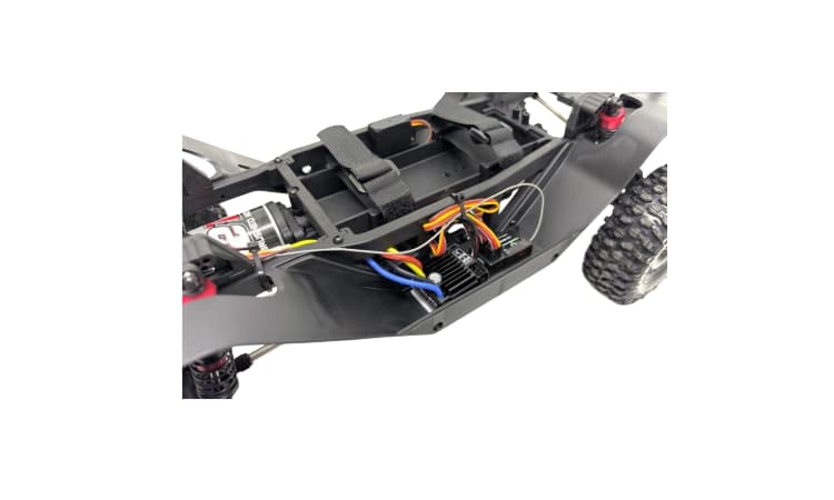 • Nuestro chasis CR4.4 está construido bajo la carrocería, ¡lo que significa que es muy robusto y puede hacer frente a los obstáculos más duros fuera de la carretera! La potencia es proporcionada por un motor de escobillas 32T 550 de alto par y un controlador impermeable con capacidad 2-3S, que transfiere la potencia a través de un robusto diferencial central y el tren de transmisión totalmente de rodamientos de bolas.