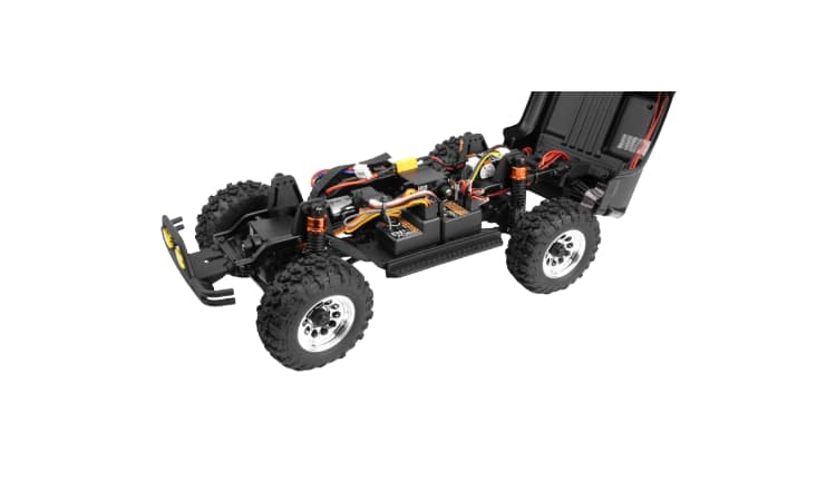 - Camión todoterreno a escala 1/18, eléctrico, con tracción integral permanente, ensamblado y prepintado de fábrica.