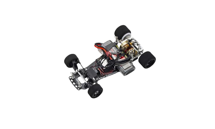 - Equipado con un chasis principal y una placa superior de carbono de alta rigidez, con una barra A trasera de FRP que mejora el agarre de los neumáticos con una flexión moderada.
