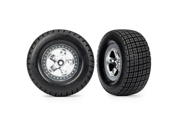 Neumáticos y ruedas, ensamblados, pegados (SCT, ruedas cromadas satinadas, tipo beadlock (perfil doble 2.2″ exterior 3.0″ interior, neumáticos Hoosier, insertos de espuma) (2) (2WD delantero)
