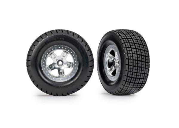 Neumáticos y ruedas, ensamblados, pegados (SCT, ruedas cromadas satinadas, tipo beadlock (perfil doble 2.2″ exterior 3.0″ interior, neumáticos Hoosier, insertos de espuma) (2) (4WD delantera/trasera, 2WD trasera solamente)