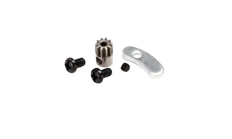 • Piñón de 10 dientes. Los piñones Traxxas le permiten ajustar el rendimiento de su modelo Traxxas. Cambiar la relación de transmisión puede ayudar a equilibrar la aceleración y la velocidad máxima en diferentes condiciones de funcionamiento. Consulte el manual del propietario para obtener más información sobre las opciones de transmisión recomendadas para su modelo. Incluye tornillos de montaje del motor y espaciador.