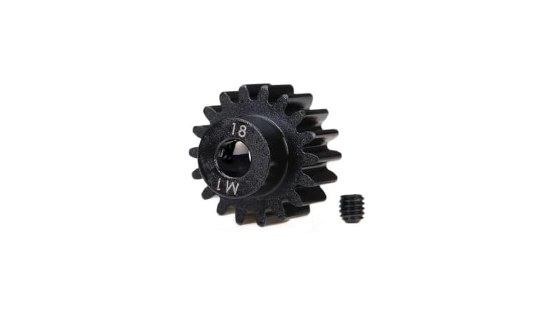 - El piñón de 18 dientes (paso métrico de 1,0) se adapta a ejes de motor de 5 mm e incluye un tornillo de fijación. (Diseñado para engranajes rectos de acero). Los piñones Traxxas le permiten ajustar el rendimiento de su modelo Traxxas. Cambiar la relación de transmisión puede ayudar a equilibrar la aceleración y la velocidad máxima en diferentes condiciones de funcionamiento. Consulte el manual del propietario para obtener más información sobre las opciones de transmisión recomendadas para su modelo.