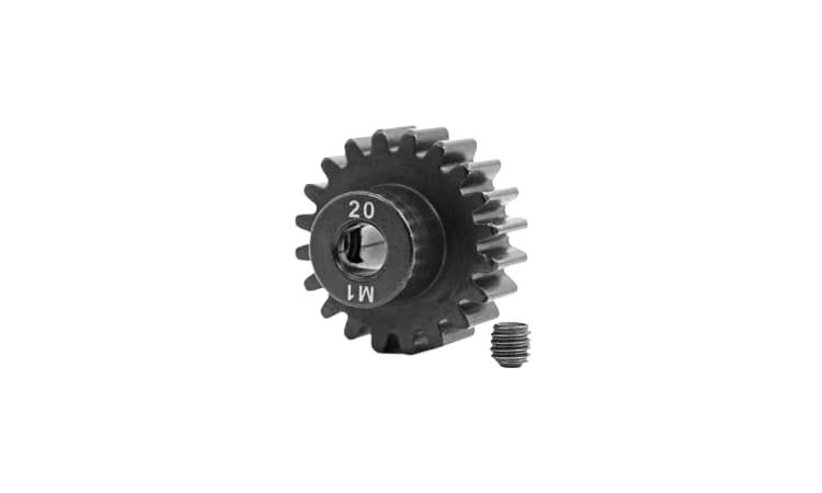 - El piñón de 20 dientes (paso métrico de 1,0) se adapta a ejes de motor de 5 mm e incluye un tornillo de fijación. (Diseñado para engranajes rectos de acero). Los piñones Traxxas le permiten ajustar el rendimiento de su modelo Traxxas. Cambiar la relación de transmisión puede ayudar a equilibrar la aceleración y la velocidad máxima en diferentes condiciones de funcionamiento. Consulte el manual del propietario para obtener más información sobre las opciones de transmisión recomendadas para su modelo.