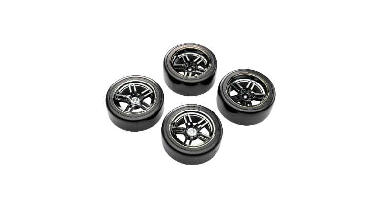 - Los neumáticos de plástico de compuesto duro de 1,9 pulgadas ofrecen la combinación perfecta de durabilidad y capacidad de derrape para cualquier superficie. Lo suficientemente resistentes para moqueta, hormigón e incluso asfalto, estos neumáticos aguantan batalla tras batalla. Vienen premontados y pegados en llantas delanteras y traseras de radios divididos en cromo negro. Se venden en juegos de cuatro.