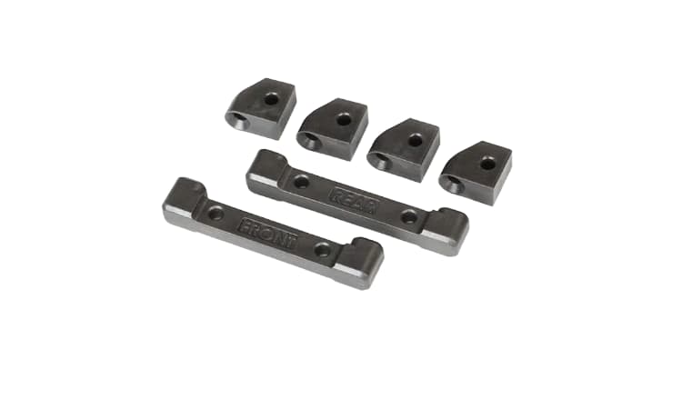 • Soportes de brazo de suspensión delantero y trasero con retenedores de pasador de bisagra (4)