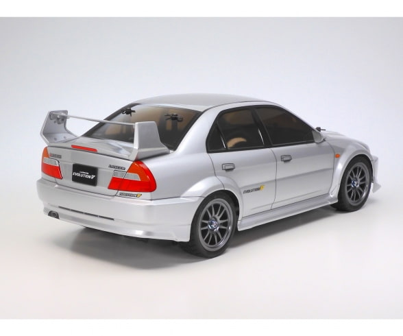 • Este coche Tamiya Mitsubishi Lancer 58713  recrea el Mitsubishi Lancer Evolution V en un kit de montaje a escala 1/10 basado en nuestro popular chasis TT-02. El Mitsubishi Lancer Evolution de quinta generación participó en carreras de rally internacionales en 1998 y ganó los campeonatos de fabricantes y pilotos. Este coche presentaba una carrocería robusta con guardabarros abultados, rejillas de ventilación y tomas de aire en el capó y el alerón trasero. Este kit lo presenta como un coche de carretera.